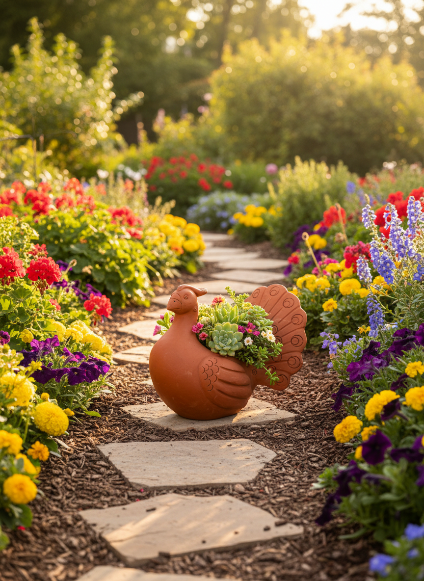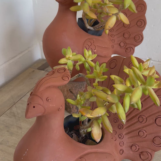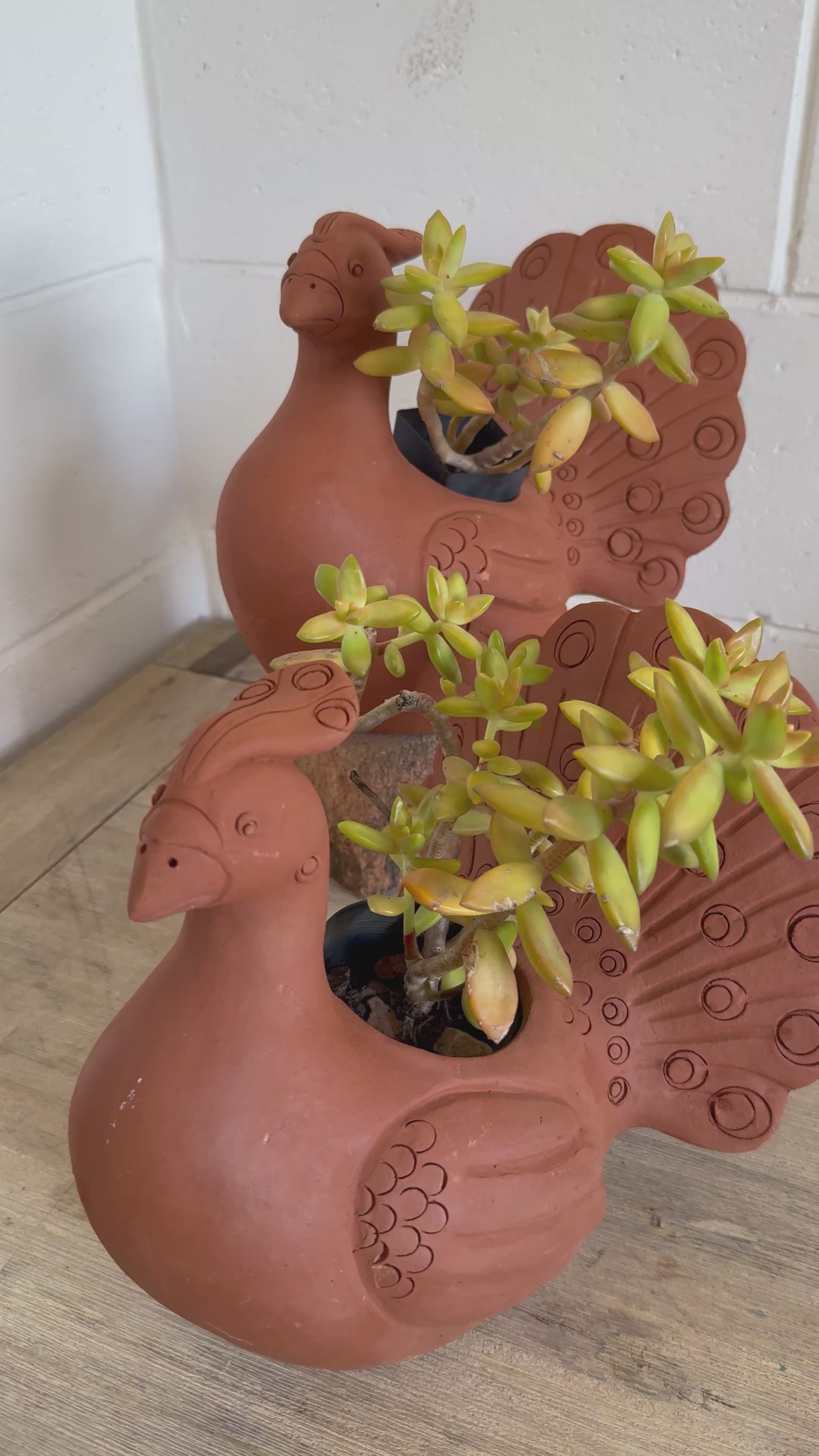 Shaped like a peacock, this terracotta planter combines sculpture and function. Ideal for succulents, herbs, or flowers in garden beds or patios.